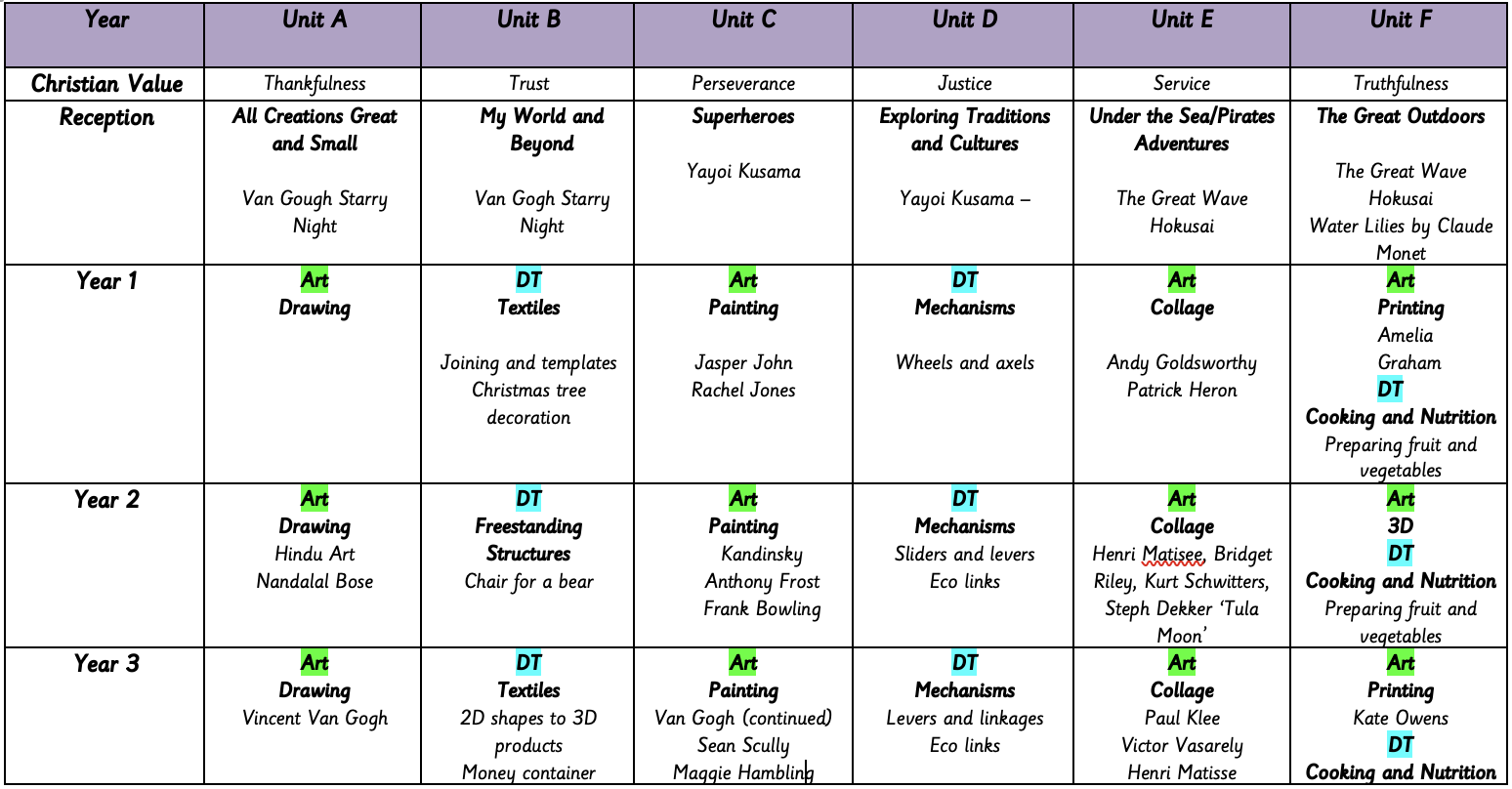 In EYFS, pupils experiment with materials, exploring patterns, colours, and different tools. In KS1 and KS2, long-term planning covers core areas like drawing, painting, collage, printing and 3D with lessons connecting art practice to history, movements, and individual artists.
